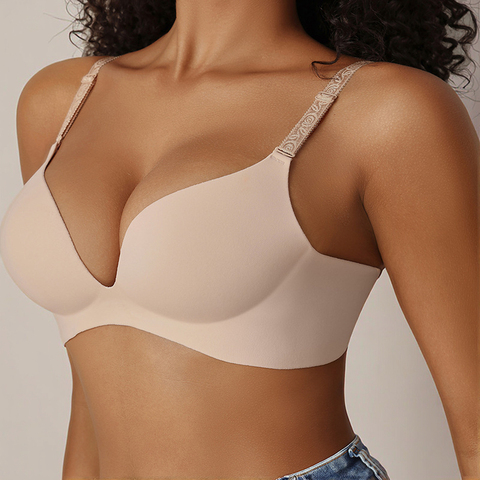 Dikişsiz iç çamaşırı toplama derin V moda kaldırma omuz askısı üç sıra toka ince nefes hiçbir çelik halka sutyen kadınlar için